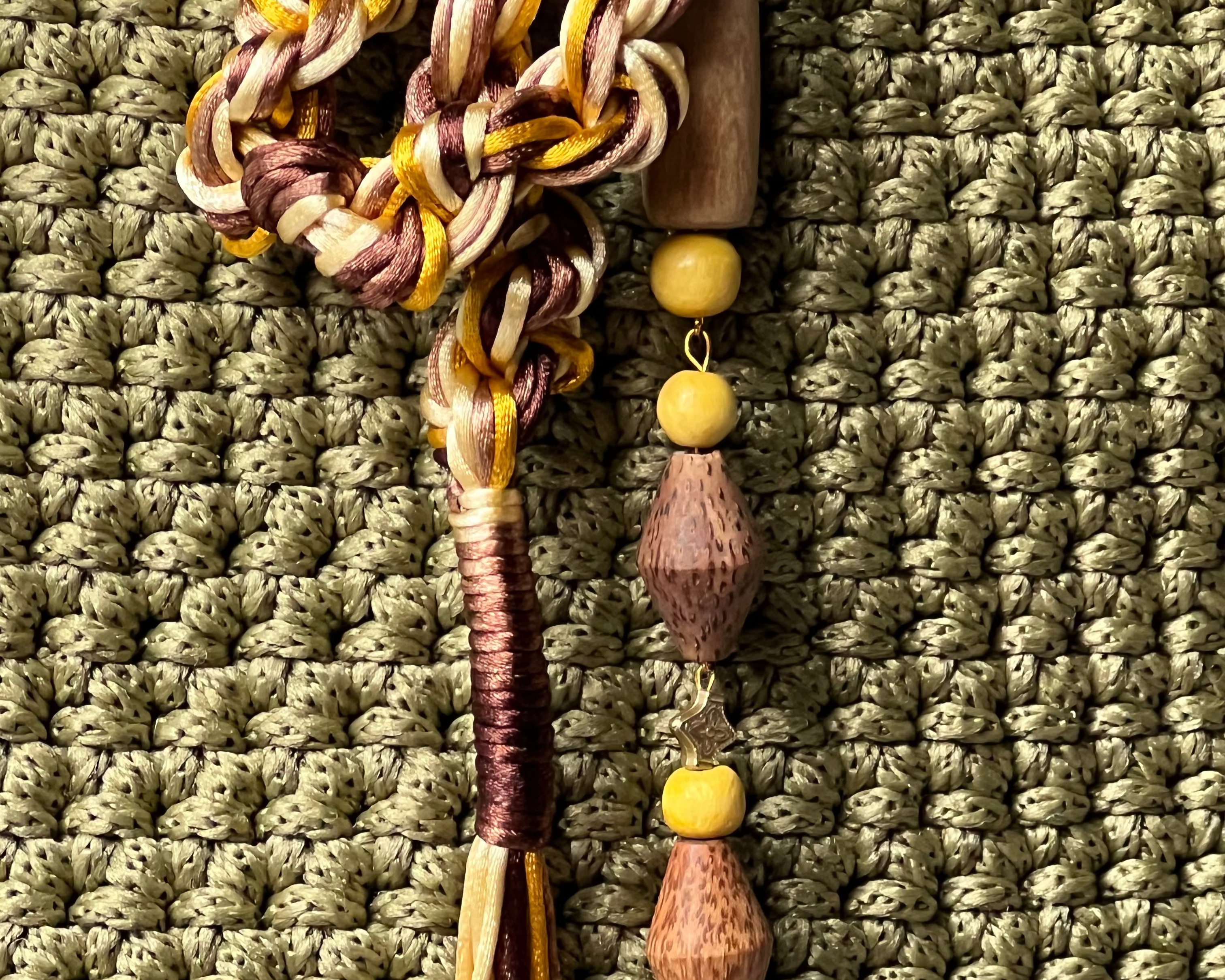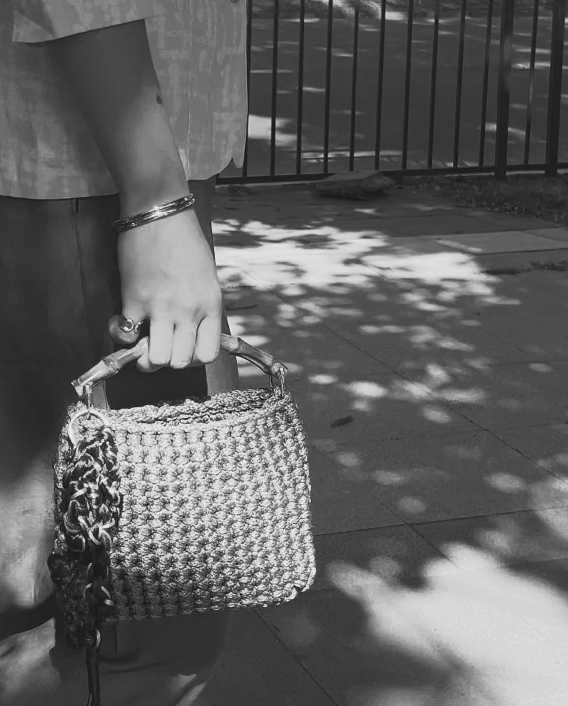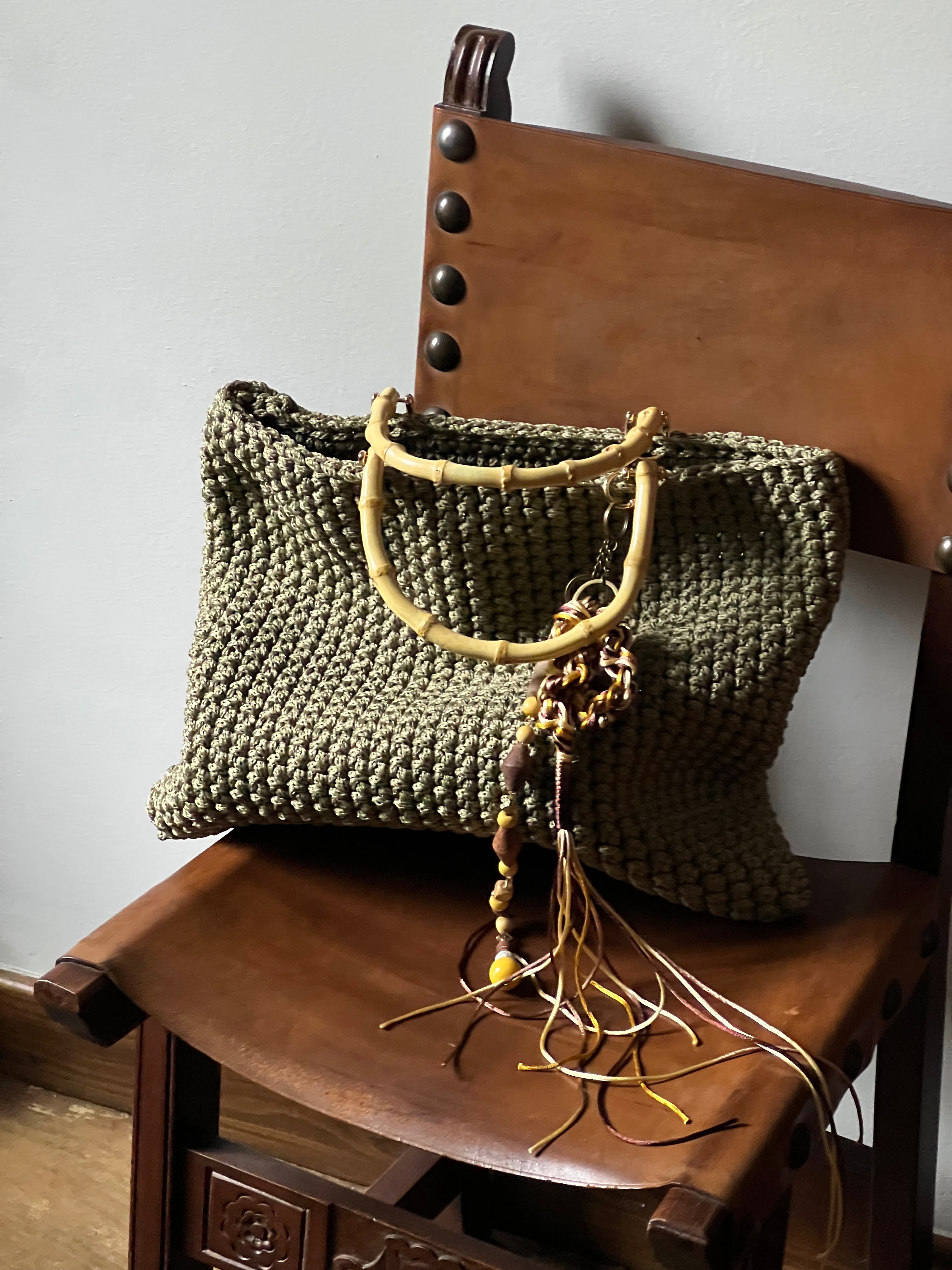 Each bag begins with a hand-crocheted foundation and evolves through handmade charms that give the piece its final identity.